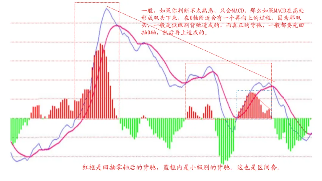 20、缠师语:“一般,如果你判断不太熟悉,只会MACD,那么如果MACD在高处形成双头下来,在0轴附近会有一个再向上的过程,因为那双头,一般是低级别背弛造成的,而真正的背弛,一般都要先回抽0轴,然后再上造成的。”