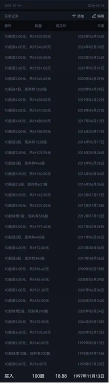 1997年11月13日以18.88元/股买入100股,到2026年4月16日累计分红5898.05元,通过多年转送股,目前持有1350股,当前股价8.21,市值1250*8.21=10262.5元,28年累计收益(10262.5+5898.05)/(18.88*100)=8.56倍,年化率7.97%。收益只能说很一般