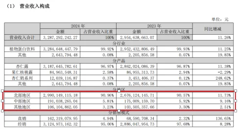 就拿口味差异来说,为什么同类产品六个核桃就南北销量都不错呢?当然,非要说杏仁和核桃不一样,核桃更受欢迎也不是不可以,但问题是,公司为啥不针对南方差异进行一些调整呢?又或者推出一些更适合南方口味的产品呢?要知道,你是上市最早的植物蛋白饮料公司,拥有很大的先发优势。