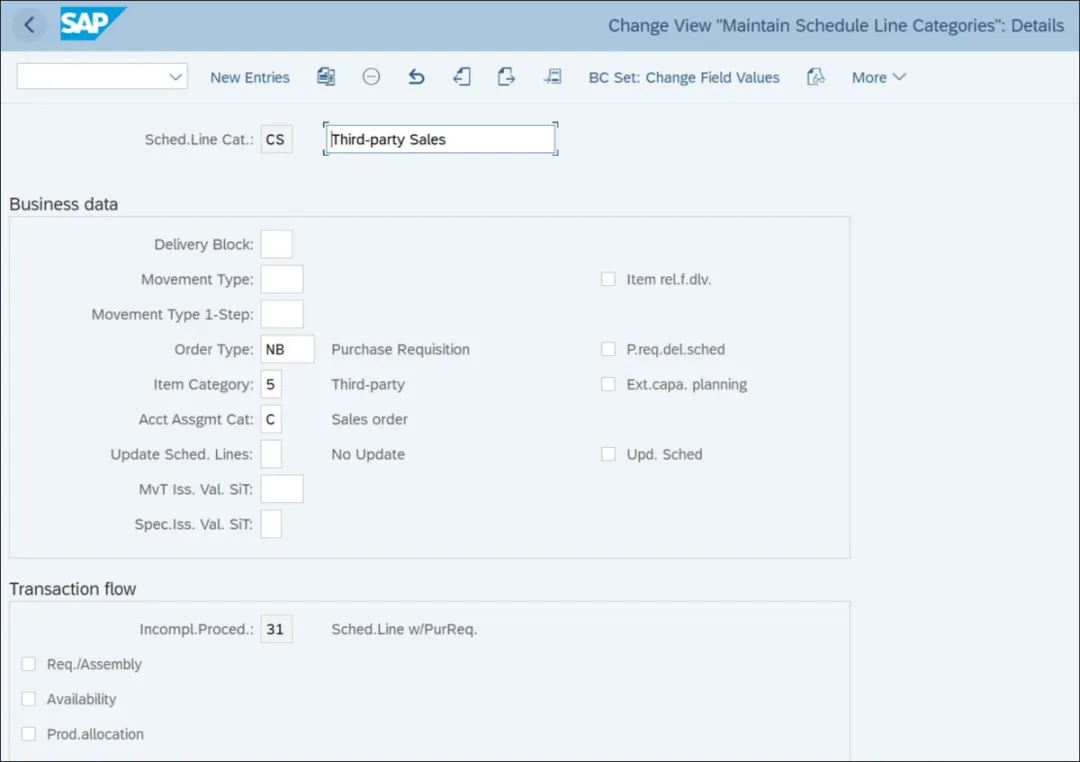 现在您应该了解了采购申请和采购订单文档类型的配置。接下来,让我们掌握计划行类别的设置,并了解第三方流程在SAP S/4HANA中是如何工作的,以及销售与分销和物料管理的集成情况。计划行类别控制销售订单项目的交货数量和交货日期。这在通过物料需求计划(MRP)确保针对客户订单的物料可用性,以及在交货处理过程中确定与交货相关的项目的库存移动类型方面起着至关重要的作用。这是第三方流程中销售与分销和物料管理之间的主要集成点之一。计划行类别定义了第三方流程采购申请的采购申请类型、项目类别和账户分配类别。根据计划行类别的定义,在处理销售订单时,SAP S/4HANA会自动创建第三方采购申请,并通过在销售订单中创建计划行来为项目建议交货日期。要设置计划行类别,请执行事务代码SPRO,然后导航至“销售与分销” • “销售” • “销售文档” • “计划行” • “定义计划行类别”。下图展示了计划行类别配置的初始屏幕。系统会显示一个预定义的标准计划行类别列表,这些类别使用字母数字的双字符代码表示。从初始屏幕中选择一个计划行类别,然后单击“详细信息”按钮以显示配置的详细信息,如下图所示。交货阻止:在计划行类别级别设置的交货阻止会阻止该特定计划行的交货处理。例如,如果系统在销售订单中确定了多个计划行类别,则对于设置了交货阻止的计划行,交货处理将被阻止。对于第三方流程,如果在计划行类别级别设置了交货阻止,则系统不会触发第三方采购申请的创建。移动类型:计划行类别中的移动类型控制交货处理过程中的货物移动。移动类型601用于大多数与客户交货相关的计划行类别。然而,对于第三方流程,货物直接从第三方交付,因此在计划行类别中分配移动类型不是必需的。移动类型一步法:这控制涉及供应地点和接收地点的货物移动的一步法程序;也就是说,供应地点的货物发出和接收地点的货物接收同时发生,SAP S/4HANA会为涉及一步法程序移动类型的此类货物移动创建一个单一的物料凭证。这些一步法程序的移动类型在用于库存转移过程的计划行类别中进行配置:NL:这是公司间库存转移过程的标准计划行类别。在“移动类型一步法”字段中分配移动类型645。NN:这是公司内库存转移过程的标准计划行类别。在“移动类型一步法”字段中分配移动类型647。然而,对于第三方流程,货物直接从第三方交付,因此在计划行类别的此字段中分配移动类型不是必需的。订单类型:此字段仅与第三方流程相关。订单类型控制第三方流程中销售与分销和物料管理集成的重要方面。在此字段中分配采购申请文档类型可确保在销售订单处理期间自动创建第三方采购申请。为第三方流程在此字段中分配采购申请文档类型。项目类别:此字段仅与第三方流程相关。项目类别控制采购文档行项目的特性。在此字段中分配第三方项目类别可确保在处理第三方销售订单期间创建第三方采购申请行项目。账户分配类别:此字段仅与第三方流程相关。账户分配类别控制针对采购订单收到的货物的消耗过账。它还有助于确定费用如何过账到不同的账户。将销售订单分配为账户分配类别可确保采购申请行项目针对销售订单进行处理和消耗。更新计划行:此字段也与第三方流程相关(请参阅表4.19中的可能值)。如果为此字段分配值1,则系统在针对第三方申请过账货物收据时会更新销售订单中的计划行。如果分配值2,则系统在收到发货通知以及过账货物收据时都会更新计划行。如果未分配值,则不会更新计划行。项目与交货相关:此指示符控制在创建交货时是否考虑销售文档中的计划行。在第三方流程中,卖方不创建/处理任何交货,货物将由供应商直接发送给客户,因此在计划行类别中无需设置此指示符。从采购订单更新计划行:此指示符也与第三方流程相关。在计划行类别配置中设置此指示符可在相应第三方采购订单的某个元素(尤其是交货日期)发生更改时,更新销售订单中的计划行。外部产能计划:此指示符也与第三方流程相关。为了准确确定第三方供应商对第三方采购订单的履行日期,必须考虑供应商的产能并计划交货日期。当设置此指示符时,在SAP供应链管理(SAP SCM;此功能的先决条件)中可以进行外部计划。如果SAP SCM不在系统环境中,则不要设置此指示符。带交货计划的采购申请:此指示符也与第三方流程相关。第三方流程的最佳实践是供应商直接将货物发送给客户。然而,根据您的业务需求,如果您希望供应商将货物发送给卖方,则设置此指示符。你若喜欢,点个❤️谢先👇