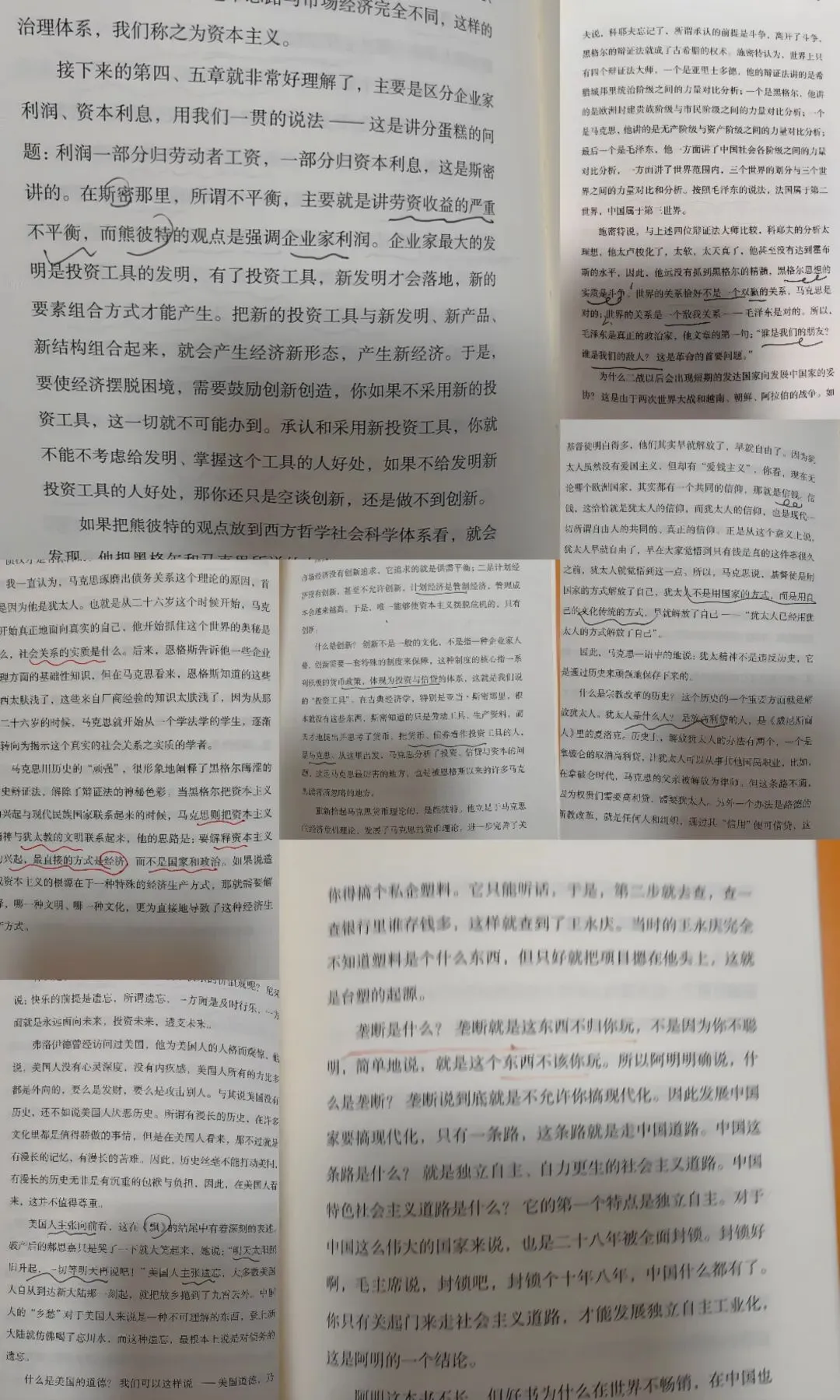 黑格尔、马克思、熊彼特,一个个观点,打开了重新认识这个世界的大门,创新只能指向对未知领域的探索。这是系统性学习的好处,不必东一榔头西一棒子的碎片化认知。重读是为了更好认知自己,了解不同,思考来时路,探索未来路。资本主义、社会主义、共产主义、第三世界等等,在近百年的历史长河里,思想家们带出一个又一个问题,经过无数的讨论、附议,认同、反对,形成的经典专著是“时代的产物,都是思考和研究当时当地社会突出矛盾和问题的结果”,所以书中缘起中,韩老师提到,马克思主义是西方哲学社会发展的高峰,讲西方要以马克思主义为指导,同时也不能离开西方的历史发展孤立讲马克思主义。