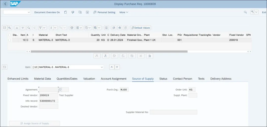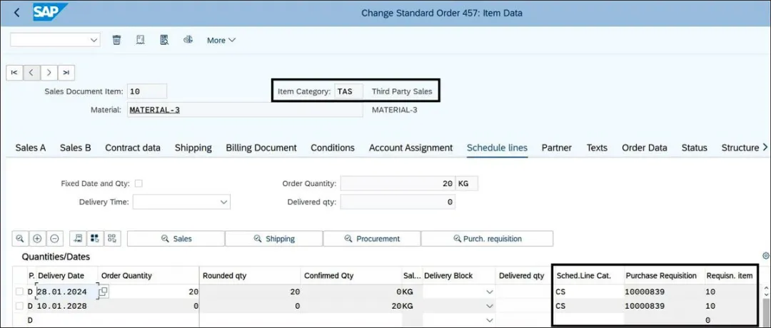 前面的公众号中解释了计划行类别在第三方流程中的重要性。在销售订单处理中,自动确定计划行类别至关重要。计划行类别的确定通过配置实现。要进入此配置步骤,请执行事务代码SPRO,然后导航至“销售与分销” • “销售” • “销售文档” • “销售文档项目” • “计划行” • “分配计划行类别”。下图展示了标准项目类别TAS分配了计划行类别CS。MRP类型是销售订单处理期间确定计划行类别的另一个标准。但第三方销售订单与MRP无关,因此在与第三方相关的计划行类别确定配置中,可以将MRP类型字段留空。下图展示了针对项目类别TAS自动确定了计划行类别CS,并针对第三方流程的销售订单行项目创建了计划行。计划行的创建也会触发采购申请的创建。下图展示了根据计划行类别配置从销售订单创建的采购申请。账户分配类别C(销售订单)从计划行类别设置中派生。采购申请中供应源(第三方供应商)的确定通过源(列表采购主数据)实现。采购申请项目的单价将从PIR中派生。在创建采购申请之后,第三方流程的下一步是创建采购订单并将其发送给第三方供应商。买方可以使用事务代码ME21N手动创建采购订单。可以使用事务代码ME59N自动参考采购申请创建采购订单。供应商将履行订单并直接将货物发送给客户。卖方处理供应商发票并创建客户发票/开票凭证。根据设置,系统在货物交付给客户或处理供应商发票之前,不会允许卖方提交发票。你若喜欢,点个❤️谢先👇