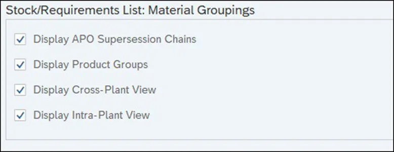 使用库存/需求清单的单独访问选项卡时,将输入物料和工厂或MRP区域。但是,在事务码中,还提供其他附加选项卡,其中包含一个名为 物料分组 的集成视图,显示不同的物料、工厂或物料需求计划区域。提供以下物料分组标准选项:- APO替换链 APO Supersession Chains当物料是SAP APO替换链(允许产品相互替换的功能)的一部分时,将显示此选项,并显示所有替换成员的MRP元素。