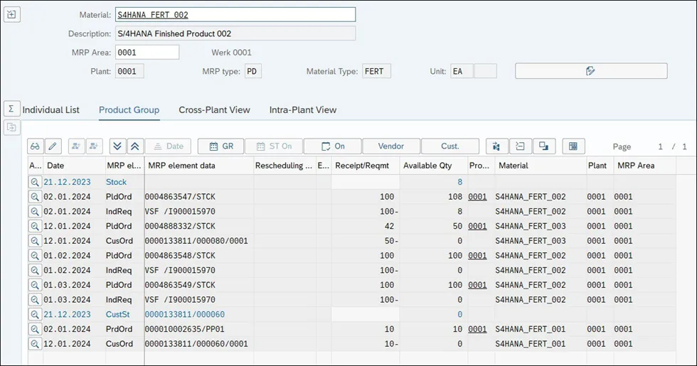 - 当物料属于产品组时,会显示此信息;它显示所有产品组成员的MRP元素。