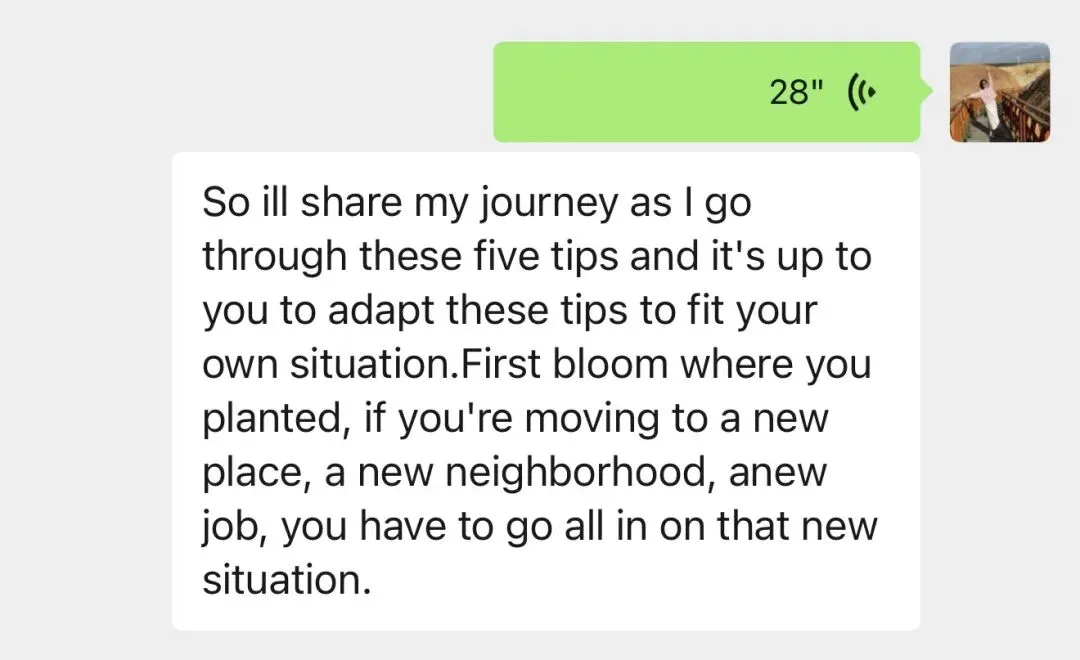 So, I'll share my journey as I go through these five tips. And it's up to you to adapt these tips to fit you own situation. First, bloom where you're planted. If you're moving to a new place, a new neighborhood, a new job, you have to go all in on that new situation.