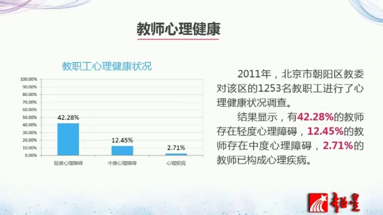 那本讲的内容呢我们主要从两个方面来讲,第一个呢就是讲教师职业与心理健康,那第二个呢我们讲通过教练技术促进教师的心理健康以及幸福感。那教师的心理健康啊其实不容忽视。最近又有很多的调查,我们看一下从2011年做的一个调查,这是北京市朝阳区教委对该区的1253名教职工进行的调查,而结果显示教师的心理健康啊也是比较堪忧的,比如说有42.28%的教师存在轻度的心理障碍,12.45%的教师呢存在中度的心理障碍,而2.71%的教师已经构成心理疾病。
