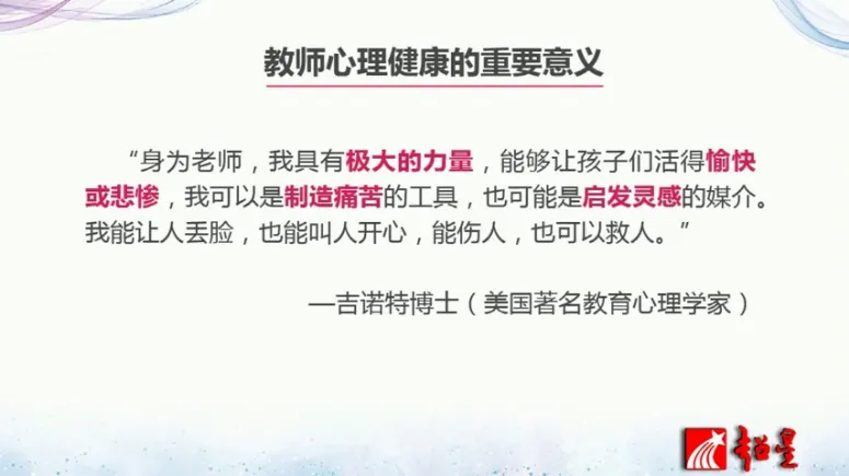 关于教师的心理健康的重要意义,就像美国著名心理学家吉诺特博士说的,身为老师我们具有极大的力量,我们能够让孩子们活得愉快或悲惨,我们也可以是制造痛苦的工具,也可以是启发心灵的媒介,我们能让人丢脸,也能叫人开心,能伤人,也可以救人。所以教师的职业不光是对家庭会产生影响,也会影响到周围很多很多人,所以他的心理健康就尤其重要。国内的学者喻国良也提出了教师职业的5个非常重要的心理健康的标准,第一个就是能够愉快地接受自己的教师角色,第二呢有良好和谐的人际关系。