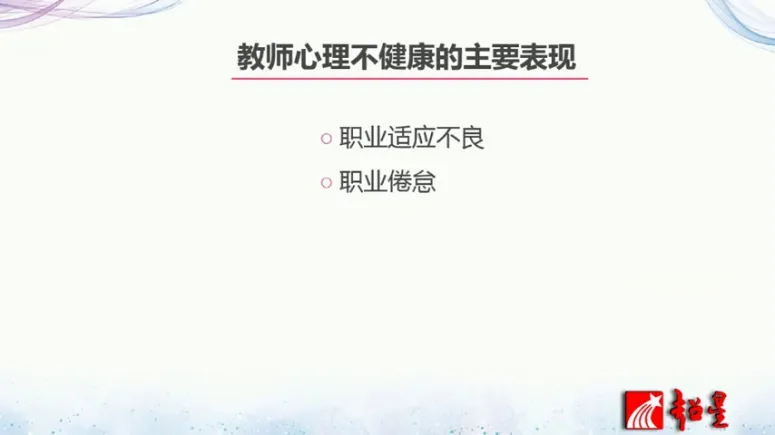 第三呢能够正确的了解自我,检验自我和控制自我。第四呢具有教育的独创性。最后一点呢就是积极乐观的情绪。那么教师心理不健康的主要表现会在哪方面呢?主要有以下的4个方面,第一个方面就是职业适应不良,尤其那些新到任的教师来说,他不一定能够适应教师这样一个职业。第二个就是对于长期从事教师教学工作的人来说,有可能出现职业倦怠。当然对于常见的一些精神疾病以及神经症,其实作为教师群体来说也有可能会出现。