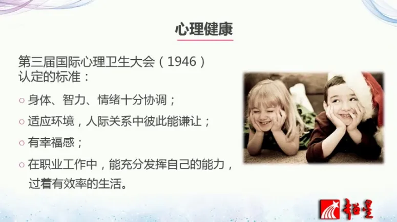 前面我们讲到了教师的心理问题,那么如何促进教师的心理健康,促进他们的幸福感?我们呢通过以下两个方面来看一下,第一个,积极心理学是如何看待心理健康的。第二个呢如何通过教练技术促进心理健康,提升幸福感。关于心理健康啊有一个标准被广泛使用,那个标准就是1946年第三届国际心理卫生大会上认定的那个标准,这个标准从4个方面来看待心理健康。第一个,身体智力情绪都十分协调。