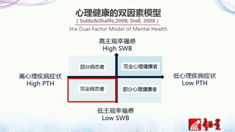 第二呢能够适应环境,人际关系中能够彼此谦让。第三呢有幸福感。第四呢就是在职业工作中能够充分发挥自己的能力,过着有效率的生活。关于心理健康的标准,2000年以后又有一些新的发展,就提出了双因素的理论。那在双c因素理论里面,大家看那个图,那个横轴是什么?就是心理的症状。就以前的心理健康的标准认为只要没有出现心理症状,那就是心理健康的那出现心理症状,那我们说这个人心理不健康,而在双因素的标准里面,除了这个心理症状以外,又加入一个纵轴,这个做作就是幸福感,这样的话就可以把人分为4类,比如说高主观幸福感,低心理疾病症状的,我们叫做完全的心理健康者,而这部分人的话心理健康状况就非常良好了。