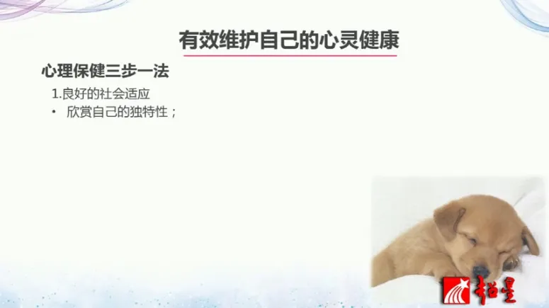第一个从精神层面来讲的话,就是无目标、无动力、无兴趣、无意志,目标缺失、智力缺乏、效率低下,这是精神层面的一种表现。第二个就是日常行为的表现,就是生活不规律,包括像饮食啊休息,人际关系呢比较紧张,还有呢像个人和环境卫生比较差,这都是心理亚健康的表现。所以大家可以对照一下上面的标准,看自己是不是处于心理亚亚健康的状况了。如果已经处于心理亚健康的状况的话,就需要去提升自己的心理健康了。那么如何维护自己的心理健康呢?我们给大家介绍一下心理保健的三步一法,这三步一法就是第一个就是良好的社会适应,怎么样才是良好的社会适应呢?