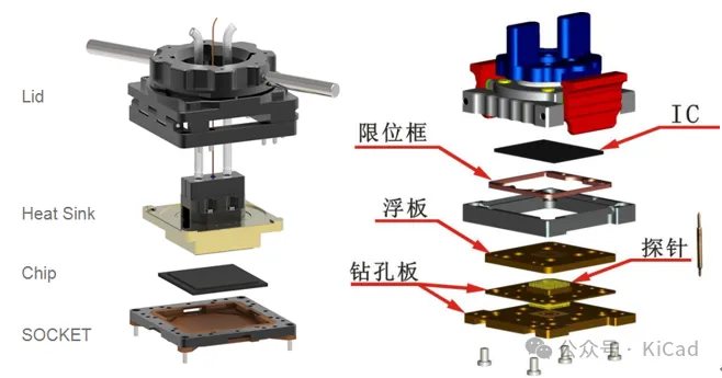 在产品开发过程中,我们首先需要了解被测产品的封装尺寸以及测试需求,例如最大单Pin的最大电流电压,工作最高频率,接触性能要求,测试温度及散热需求等,在设计socket时会根据这些需求挑选满足要求的探针,按照相应的封装尺寸去设计相应的socket结构,同时还要保证socket的结构能够适配所使用的测试机械手(handler),如图4-1所示为常见socket。