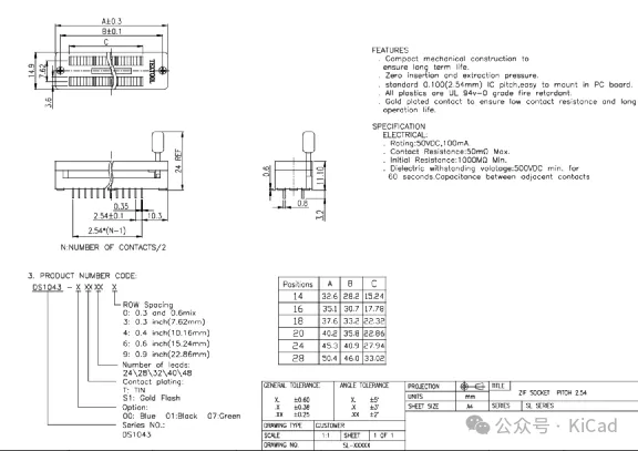 DIP系列芯片测试所用插座基本都是使用IC锁紧座,这里以DIP14IC锁紧座为例讲解插座的PCB封装。图4-6是锁紧座的尺寸信息,读者可据此制作锁紧座的封装。