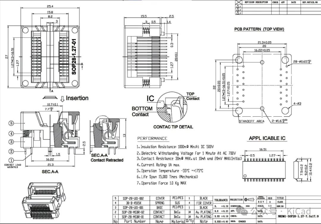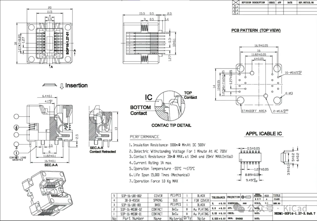芯片和芯片测试座引脚接触的部分:当下芯片与芯片测试座引脚接触的主流接触方式是弹片和探针结构。弹片主要是利用低阻抗的铍铜铜质材料,模具铸成弹性结构,为芯片接触提供接触力支撑以及减小接触阻抗。目前各大主流封测厂,还要求弹片至少具备1W次的寿命要求。常用的弹片接触芯片方式有两种,一种是单片双触点形式,另外一种结构是探针。单片双触点形式,一般出现在HMILU的SOP测试座、QFP测试座比较多,这两种封装的引脚外凸,需要弹片的夹型结构来固定并导通。