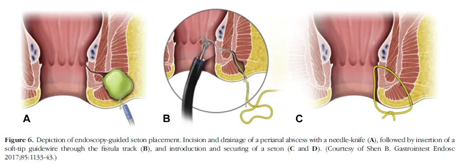 4、盆腔脓肿:经皮超声穿刺引流治疗克罗恩病腹腔、盆腔脓肿已经写入欧洲克罗恩病和结肠炎组织(ECCO)指南,但受限于深度、部位的个体差异,有效率14%-85%。盆腔脓肿EUS-GD:影像学有效率100%,临床有效率85.7%,完全消退42.9%。适应症:非恶性肿瘤引起的近肠壁脓肿,脓肿直径≥2厘米,脓肿距肠壁最短距离≤3厘米。操作方式:抽吸、灌洗、引流、支架。观察终点:临床改善、影像学改善。