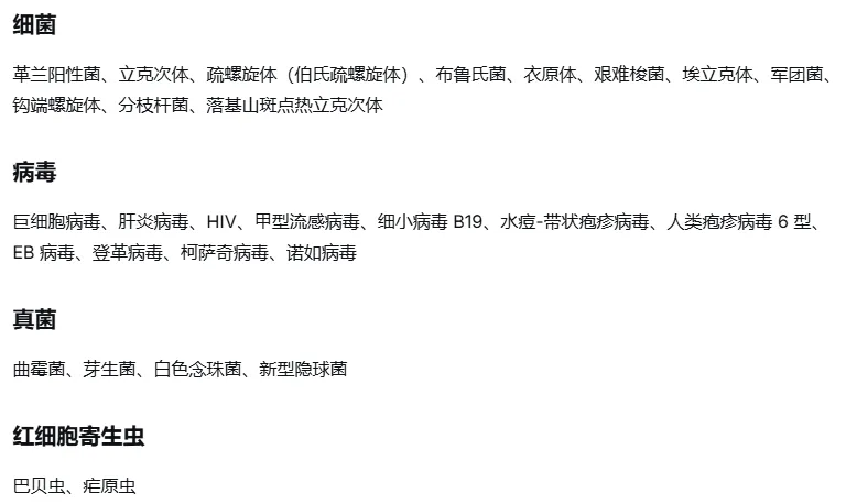 多种病原体可导致,包括细菌性心内膜炎、HIV、巨细胞病毒(CMV)、落基山斑疹热、疟疾、巴贝虫、侵袭性曲霉菌病等。
