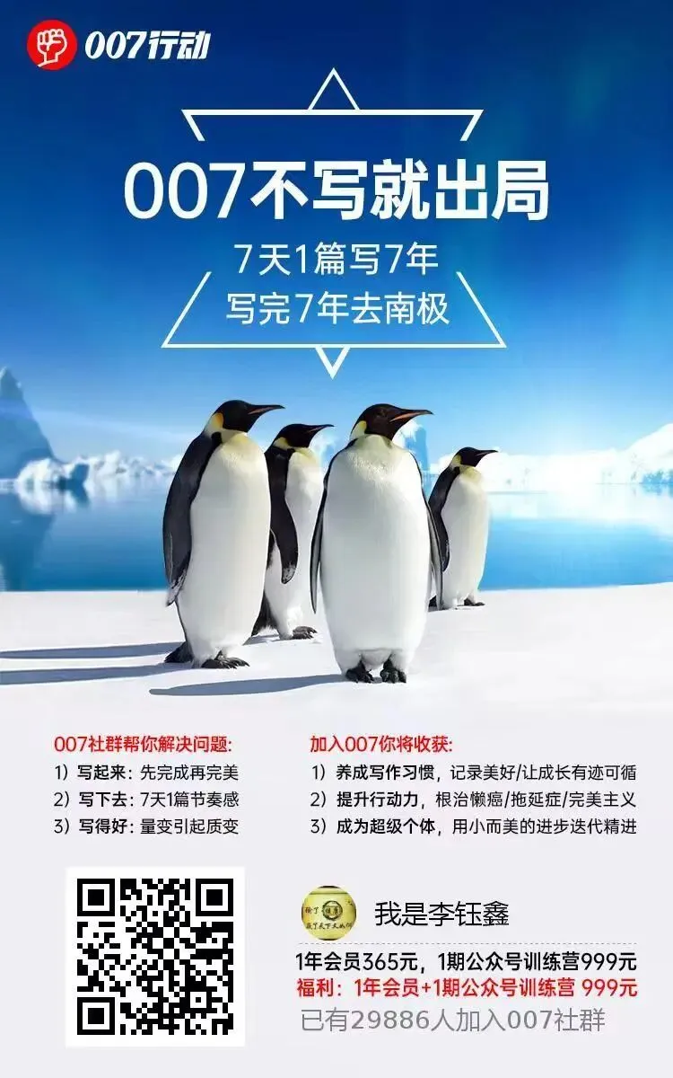我已跟随007写作1183天了,如果您也爱好写作,想链接到更多优秀的人,欢迎扫码加入,咱们一起写起来!用文字记录生活,留下成长的岁月。