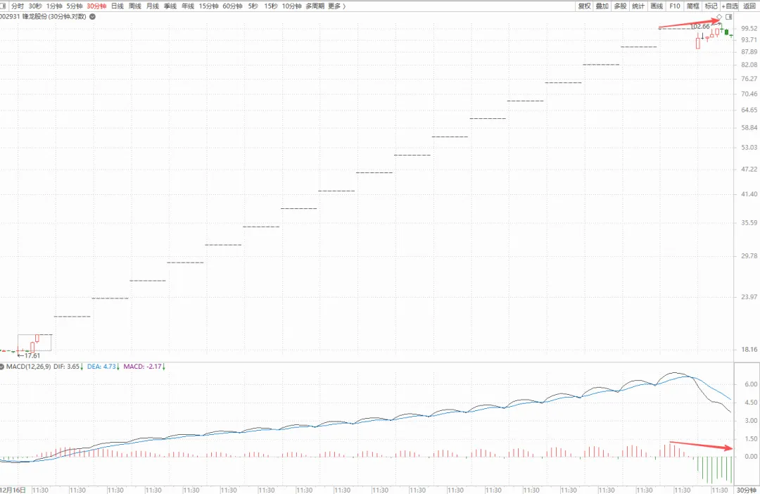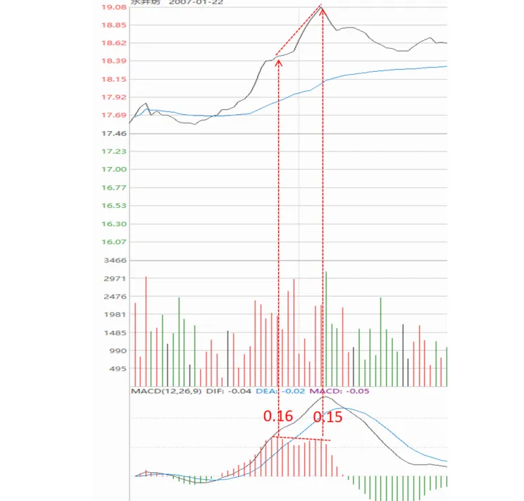 注:这句话什么意思呢?也就是说比一分钟还小的级别里,只能通过MACD的单色柱子进行判断,其高度的伸长就会缩短,这也是一种背驰,这和后面说的小转大是一个概念。看原文实例分时图: