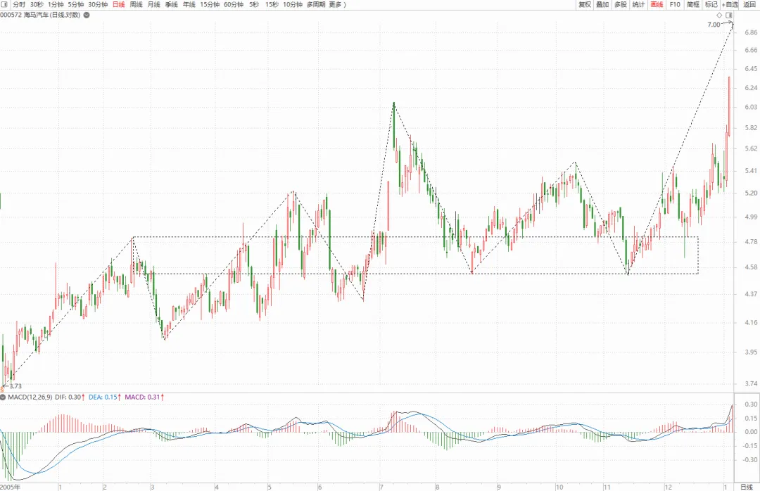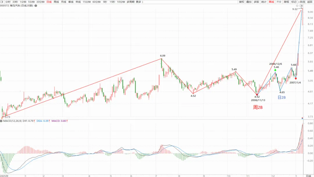 7、本节课中缠师列举的实例000572周线的贰买是11月17周4.52那个贰买。这是周线上一个盘整之后的买点。而日线上的贰买是12月12日4.65这个贰买,这是中枢离开段走势中贰买,日周贰买靠的非常近,也就是缠师说的日线与周线上出现双重的第二类买点。看图: