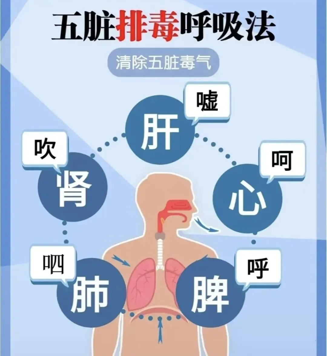 五脏排毒“六字”:指的是“肝嘘(xū)、心呵(hē)、脾呼(hū)、肺呬(sī)、肾吹(chuī)、三焦嘻(xī)”,发音时唇齿喉舌部位不同,并辅以相应简单的肢体动作和意念,来调整肝、心、脾、肺、肾、三焦乃至全身的气机运行,达到调节心理、强壮脏腑、柔筋健骨等强身健体、养生康复的目的。