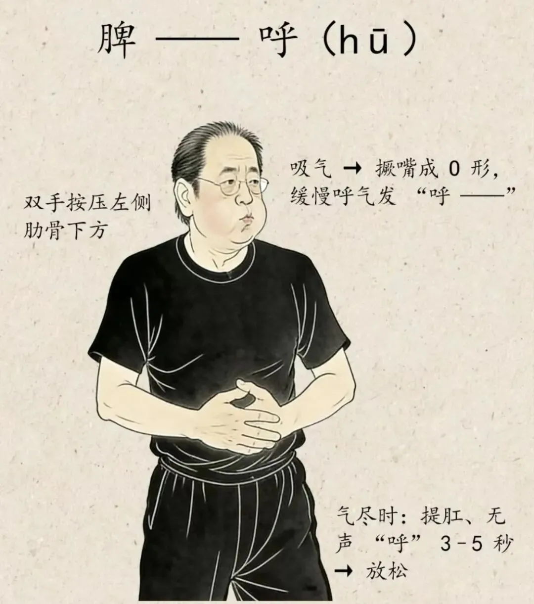 脾脏的呼,呼的时候发出来在嘴巴,因为脾开窍在唇,嘴唇的唇,所以呢,你要把嘴巴变成O字形,脾脏在我们的左手,左肋部的下方。“呼......”,同样的,呼到最后,将最后一口气,最后一口没有声音的静那个气发出来,“呼......”,这就是呼。