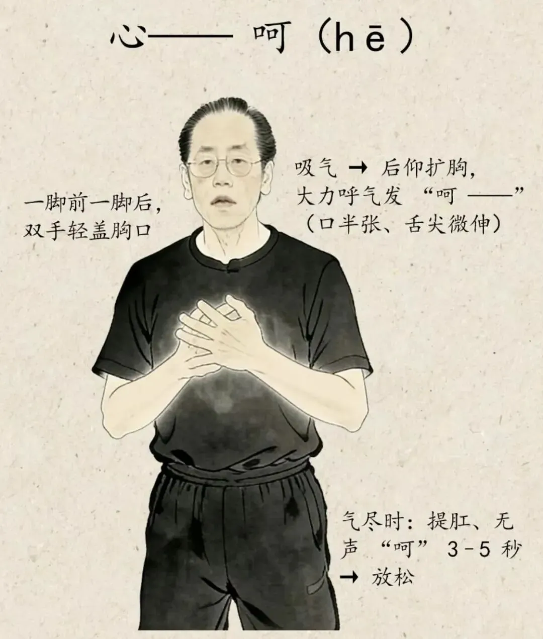 2.最后一个无声的 “呬”(音同思)的时候一定要集中精神和意志,全身崩紧,这一步没有做到位等于白练;