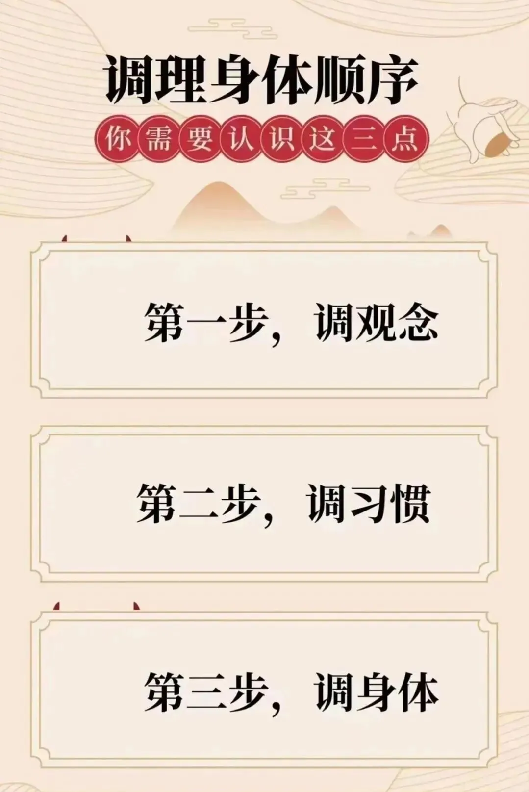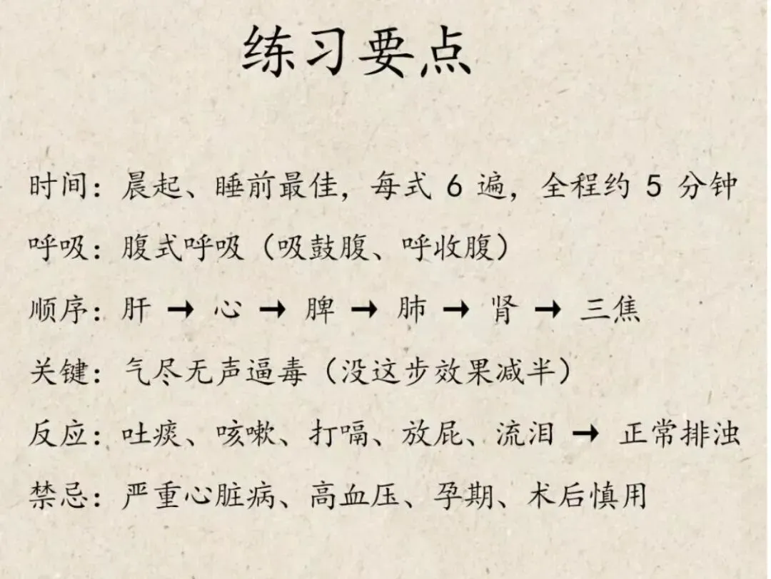 注意事项:根据练习时的时间做相应脏器的动作,然后按五行相生的顺序依次做。比如,在早上练习时,可以按脾、肺、肾、肝、心、三焦的顺序练习。