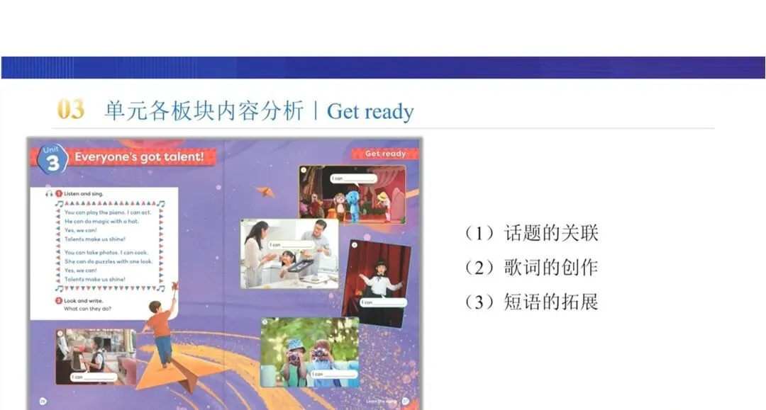Get ready | Talents make us shine | 英语歌曲 | 以朗朗上口的歌曲呈现不同类型的个人才能,激活单元话题,铺垫核心词汇与短语 |