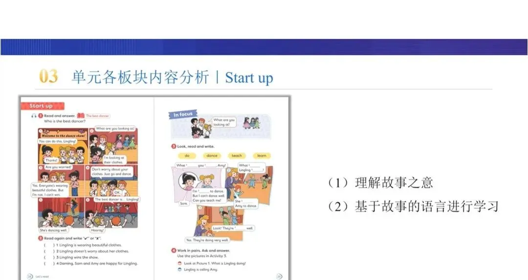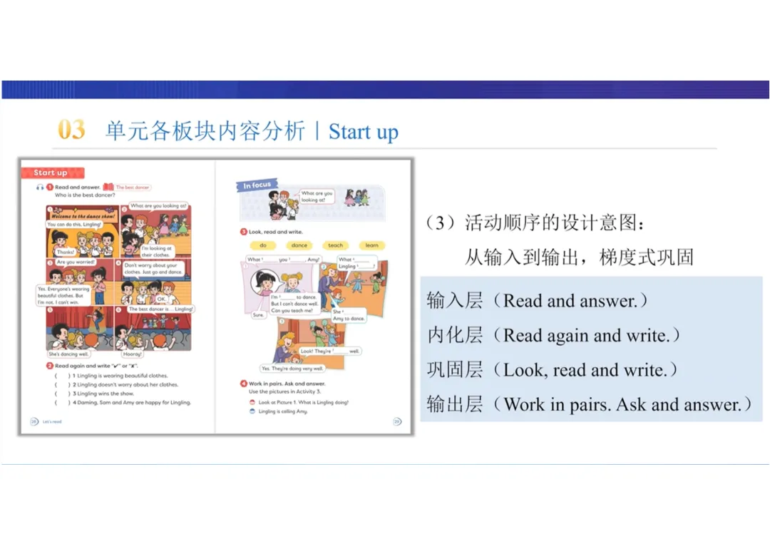 本板块是单元核心语言的启动学习环节,通过《The best dancer》配图故事,在情境中渗透现在进行时特殊疑问句的语法知识,同时传递“专注与热爱比外在形式更重要”的理念,培养学生的自信心。活动设计遵循“输入层-内化层-巩固层-输出层”的梯度,实现从语言输入到迁移应用的闭环。