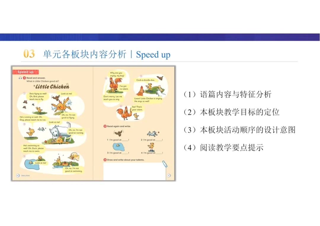 Speed up | Little Chicken | 配图故事 | 讲述小鸡羡慕其他动物的本领,尝试学习却屡屡受挫,最终发现自身唱歌天赋的故事,深化“人各有所长”的主题 |