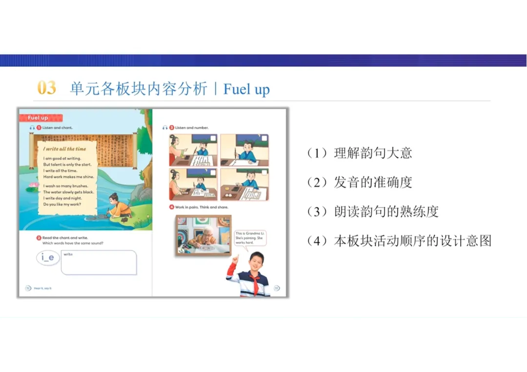 Fuel up | I write all the time、The story of Wang Xizhi | 英语韵句、人物故事 | 以“墨池”典故和“王羲之吃墨”的故事为载体,渗透语音知识,传递勤奋努力对发展才能的重要意义 |