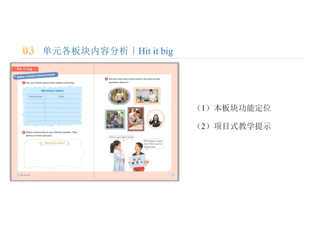 Hit it big | Make a family talents board | 项目式实践任务 | 引导学生调查家人的才能,制作家庭才能展板并进行班级分享,实现语言的综合运用与迁移创新 |