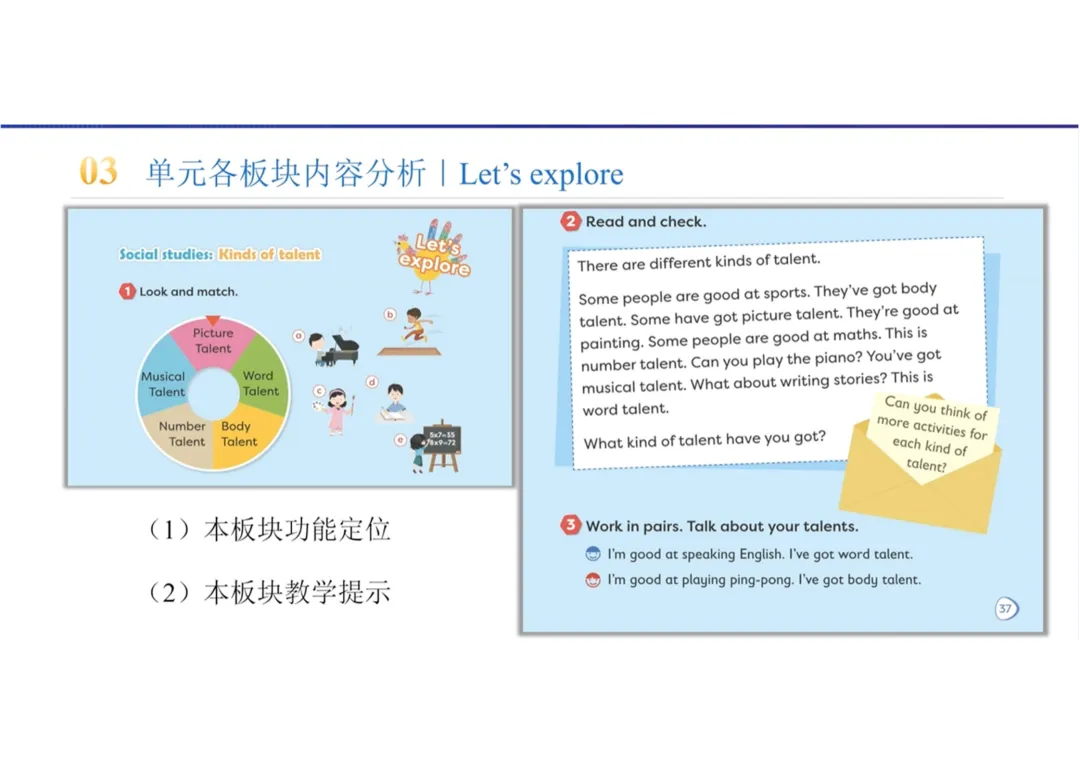 本板块为可选教的跨学科主题学习环节,基于霍华德·加德纳的多元智能理论,对才能进行科学分类,实现英语与社会科学的跨学科融合,帮助学生进一步理解才能的多样性,建立更全面、科学的自我认知,学会肯定自己、欣赏他人。