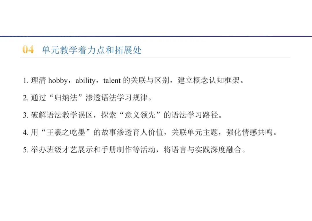 5.单元教学是否有效落实了学科育人目标,学生是否建立了对才能的正向认知,是否实现了语言学习与品格塑造的融合;