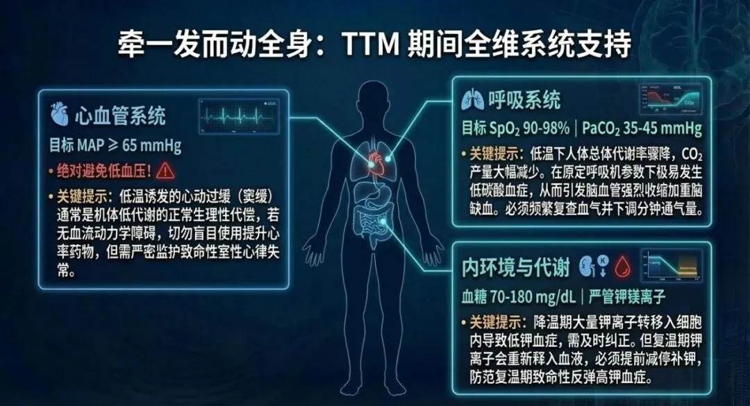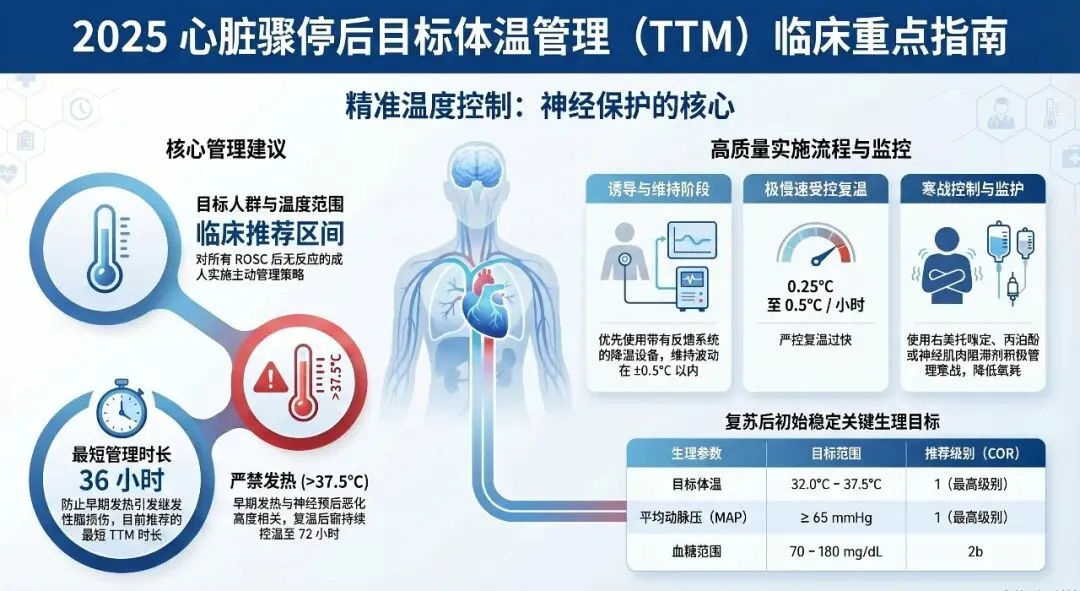 心脏骤停自主循环恢复后的氧合、血压和通气目标是什么?心脏骤停患者在恢复自主循环(ROSC)后,优化氧合、通气和血压目标对于减少神经系统后遗症和多器官功能障碍至关重要。根据最新的2025年美国心脏协会(AHA)与欧洲复苏委员会及欧洲重症医学会(ERC-ESICM)等指南,具体目标如下:
