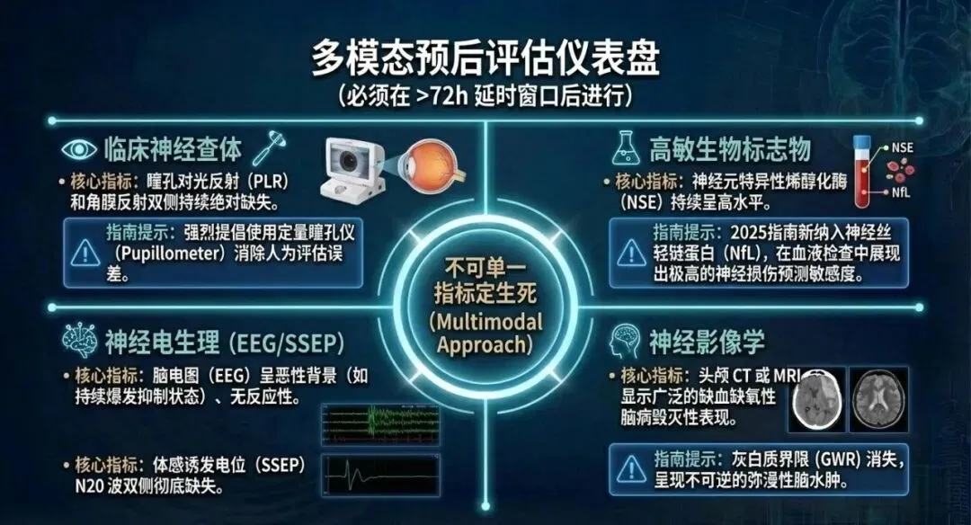 根据最新的2025年AHA和ERC-ESICM复苏后管理指南及国内专家共识,推荐采用以下四大类核心指标,并首次区分了预后不良与预后良好的预测指标: