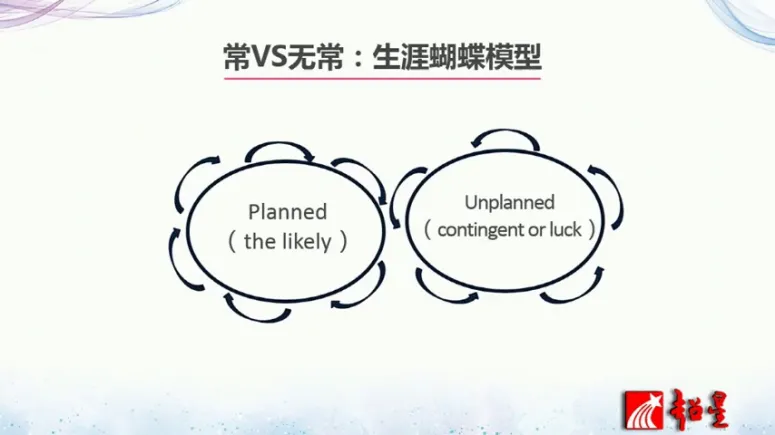 那么情绪的产生呢跟人的经历有关系,谈到经历,我们可以从一个缘字来看,那什么是缘?在我的概念中缘跟偶然性有关系。那我们下面来看一下生涯蝴蝶模型,来看一下什么是常什么是无常。那生涯蝴蝶模型的左边呢是一个计划性,右边呢是偶然性。人的发展呢就是计划性和偶然性交织性产生的。比如说在我的职业生涯的早期,在高中的时候呢我想当个医生,但是高考结果出来以后,是让我学了心理学,所以这种偶然性发生了以后,我必然要去适应这种偶然性,重新调整我左边的计划性。