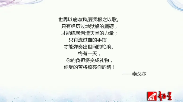 遇到一些挑战或是不顺心的事情,那么大家就觉得逆境怎么会变成一个圆呢?那其中我们的心态是非常非常重要的。下面我给大家讲一个乔布斯的例子,乔布斯创立了苹果公司,达到一个辉煌之后,曾经有段时间啊被自己亲手聘任的CEO开除出了苹果公司,那段时间是一个最灰暗的日子,但是那段时间他痛定思痛之后,他的职业生涯又达到了新的顶峰。乔布斯在回忆经历的时候,他说要感谢这样一段经历,说那段经历让他对生命又有个新的感触,就像泰戈尔在一首诗里面写到,世界以痛吻我要我报之以歌,只有经历过地狱般的磨砺,才能练就创造天堂的力量。