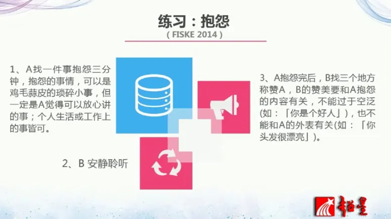 那么如果你有伙伴的话,对方抱怨完了以后,我们可不可以找换一下角色?如果你作为一个人的话,你抱怨完以后思考一下,在你刚才的抱怨过程中有没有可以值得赞美自己的地方?比如说你觉得最近啊工作太忙了,没有照顾家庭,你觉得这是你最近最痛苦的事情。大家想想从刚才抱怨的这个内容里面有什么值得赞美的地方?如果你工作非常忙的话,一定属于你工作内工作能力还可以,领导交给你很多的任务。另外一点,当你觉得对家庭疏于去照顾的话,说明你非常具有家庭责任感。所以我们可以通过那些负面的这种情绪里面,找到一些正面的力量。