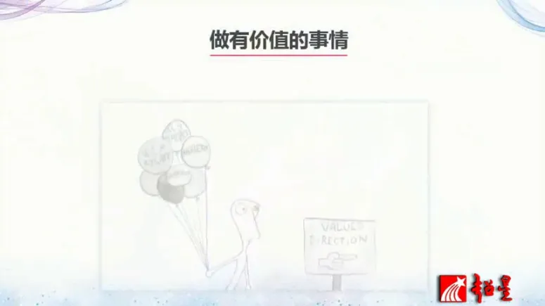 所以针对负面情绪来说,非常重要的一件事情就是做有价值的事情,行动非常非常重要,就像这个图片一样,这个人拿着一个气球上面,大家看到都标着很多的负面情绪,这个比喻是什么呢?就是负面情绪其实每天都会存在的,那对于我们来说非常重要的事情,就是做有价值的事情,我们去体验这些负面情绪背后的指引,他们想告诉我们什么?针对这个来做事情,当我们沿着价值前行的时候,我们的负面情绪会越来越低,这时候你就会感觉到自己做对事情了。
