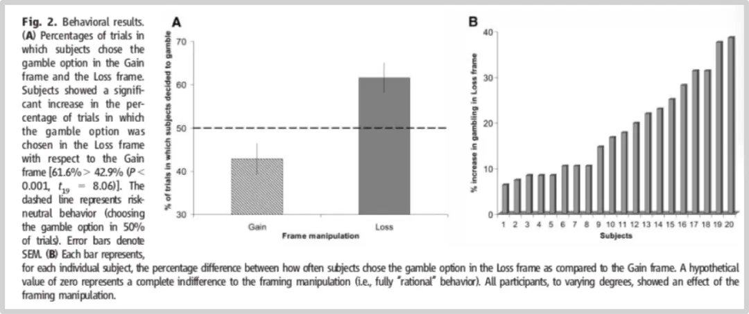 尽管结果毫无差异,但在“损失框架”下,人们会本能地感到恐慌。更可怕的实验还在后面:当被诱导参与一个输多赢少的赌博时,那些被“损失框架”激怒的人,有62%选择了冒险一搏,而“收益框架”组只有43%。
