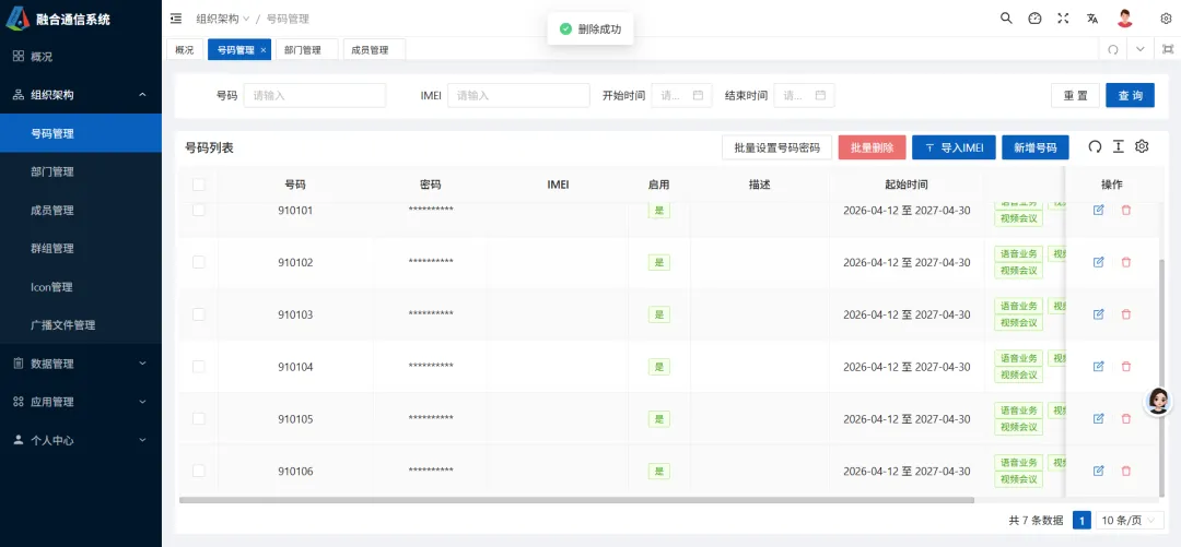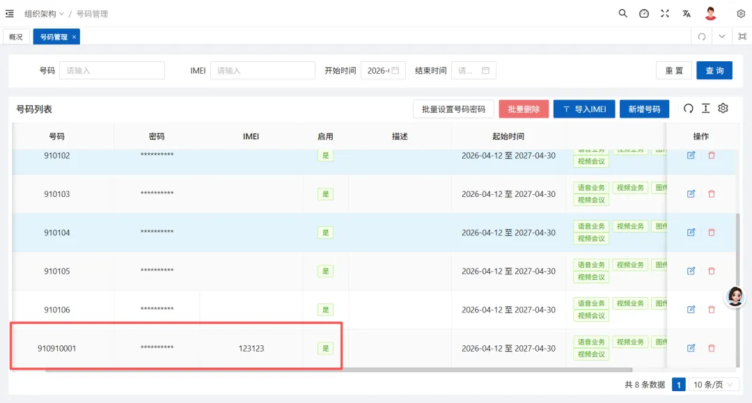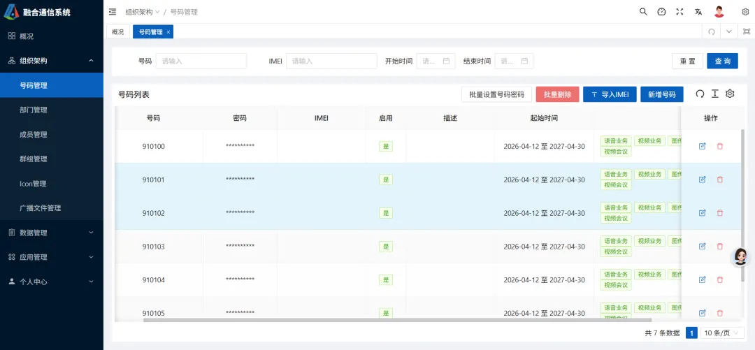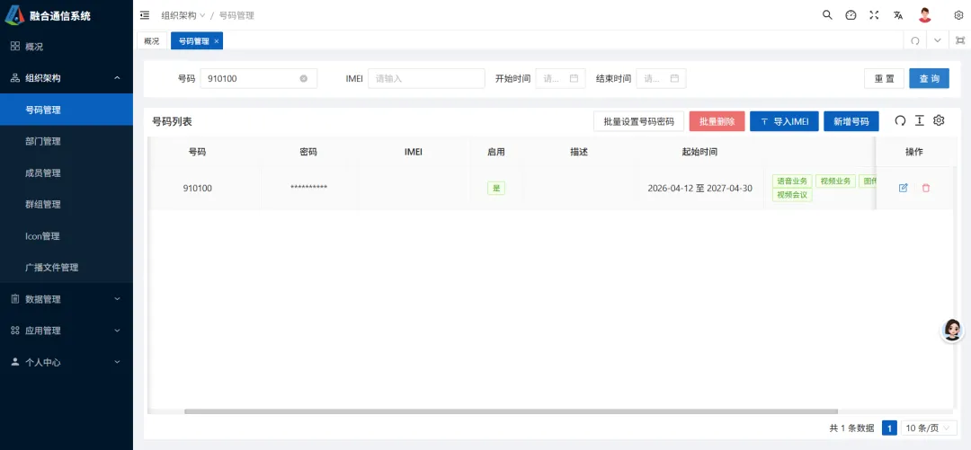 登录系统后,点击进入到组织架构相关界面里,这是界面的主体部分,主要实现对终端号码的管控。