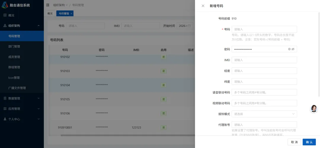 同时也可以选择新增号码,输入号码、前缀、密码等字段就可以成功 添加 。