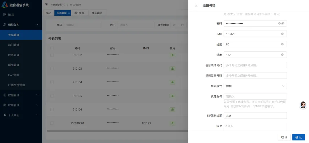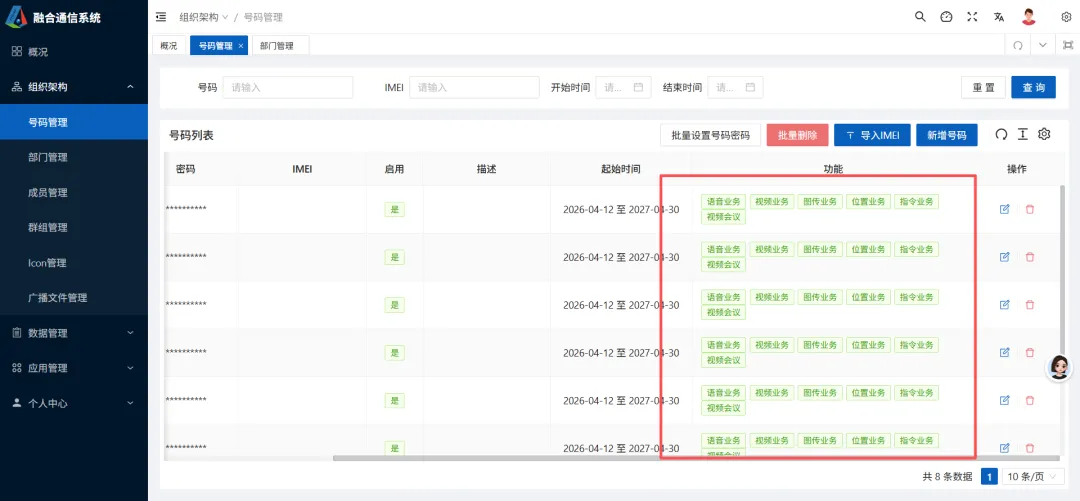 每一个号码在调度平台都有不同的权限,基本功能都有语音业务、视频业务、图传业务、位置业务、指令业务、视频会议。