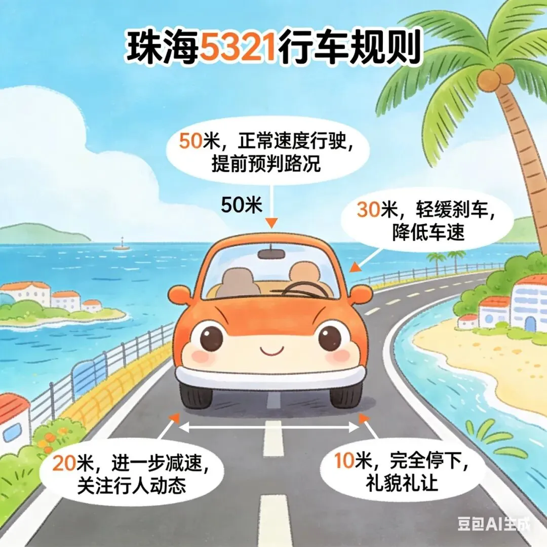 • 斑马线严格执行5321礼让标准(50米减速、30米备刹、20米停车、1米让行),主动礼让行人与非机动车,珠海交警严查不礼让。