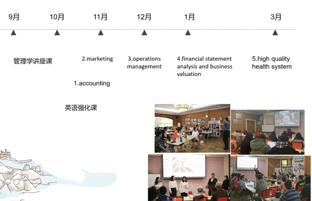通过时间轴,可以看到9月10月是比较轻松的,都是一些管理学类的讲座课。接下来的英语强化课主要是帮助学生提升英语水平。
