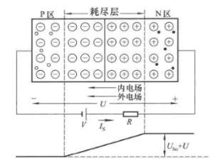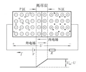 外电场与内建电场方向相反→ 耗尽层变窄 → 势垒降低 → 多数载流子大量扩散 → 形成较大的正向电流。