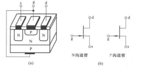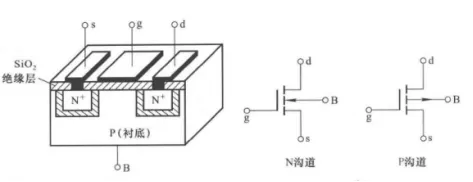 结构:P型衬底,两个N+区(源极S和漏极D),栅极G覆盖在两者之间的衬底上。