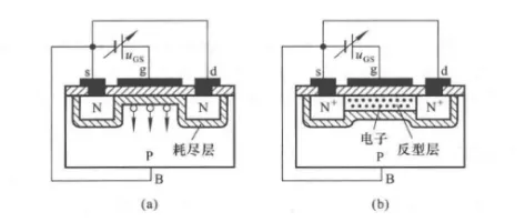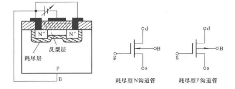 结构:在制造时通过离子注入,预先在P衬底表面形成一层N沟道(即使VGS=0也存在)。