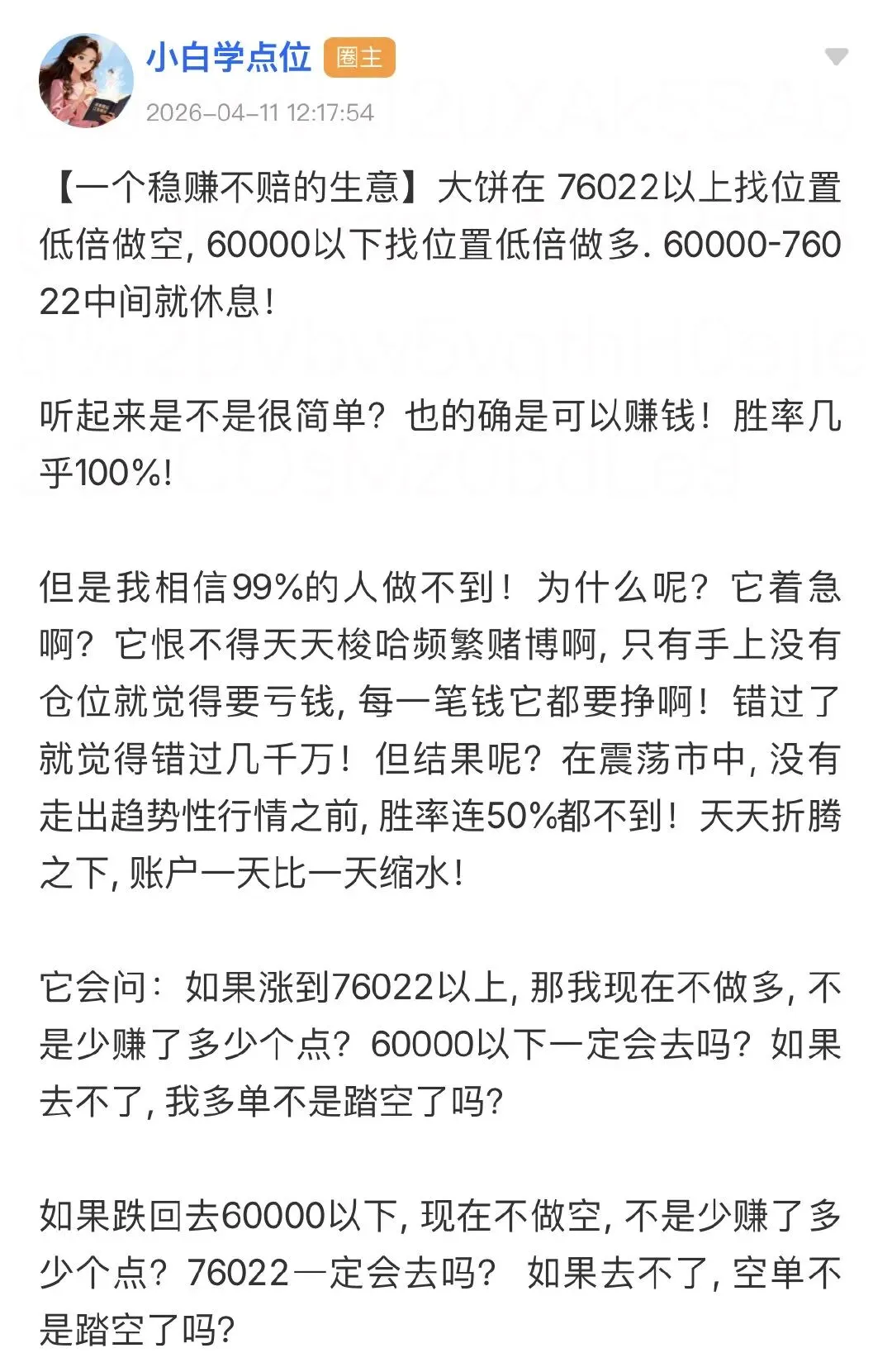上周我给大家的建议你听进去了吗?是不是应验了?大家都知道的事情,只是你不知行合一而已!上周我给出的瓶颈77.754-78.982是不是非常厉害?我们观察到多次在6小时kc下轨支撑住,因此6小时kc下轨成为判断上升是否结束的重要判断指标!我们观察到多次在日线kc下轨支撑住,因此日线kc下轨成为判断上升是否结束的最终确认指标!4月份的变盘时间节点: 4月19日、4月22日、4月25日!